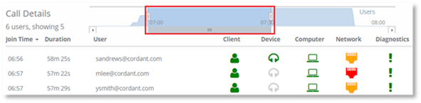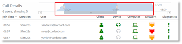 The time period provides details of the conference attendees that were actually participating in the conference during that selected time period. Only those users who were attending the conference between the time when the selected user joined and left the conference, would affect that users call quality.