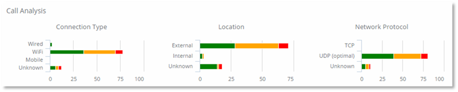 Call Analysis groups the user’s calls into the key factors that can influence the quality of calls. This analysis, provides you, the Help Desk Technician with a general understanding of the typical pattern for the user (Example: if they use wireless a significant amount of the time). By grouping these calls and identifying the measured quality, Call Analysis can help identify broader problem areas that the user is experiencing. Knowing this information, will enable you to provide not only information and advice on a specific call, but also general advice on their usage.