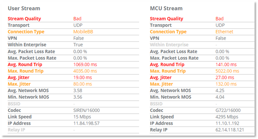 If there is a network issue, it is highlighted by a color change from green to yellow or red. The table below describes the Network information provided for both the MCU and User streams, additionally the table provides the thresholds that Microsoft utilizes to determine the classification of network calls into good, poor or bad.