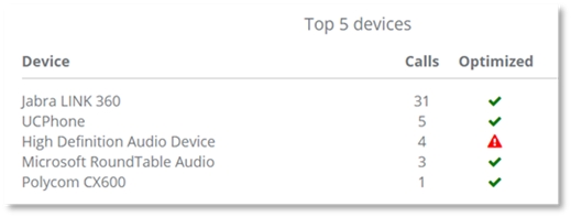 The Top 5 Devices table lists the main devices the user is utilizing, and provides information on whether those devices are optimized for providing high audio quality. This information can help you in determining if the user should replace the existing device with an optimized device. The user will receive a better overall experience if they avoid non-optimized devices.