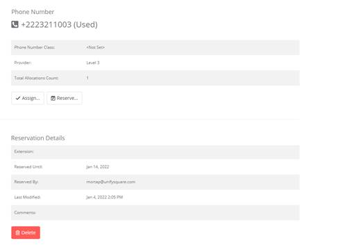 5. On the Phone Numbers details page Select Delete of the corresponding Reservation