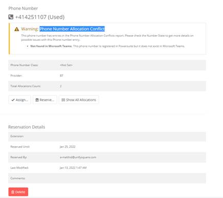 •Reserved in PowerSuite: a Reservation was found in PNMS for a Phone Number already assigned on a Platform.