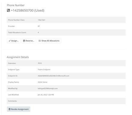 o Lookup the assignment for Adele (phone number) and then revoke the assignment to remove the corresponding phone number/extension in Teams.