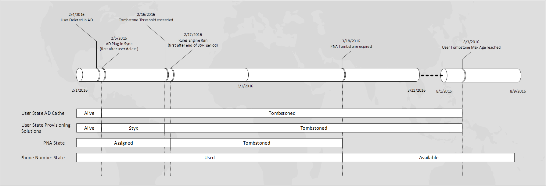 During the time period until February 16 2016, the Phone Number Allocation remained as Assigned, whilst Bob Richardson was classed as Alive and in Styx State in both Active Directory cache and Provisioning Solutions. The Phone Number had an Allocation, and therefore it was in Used State.